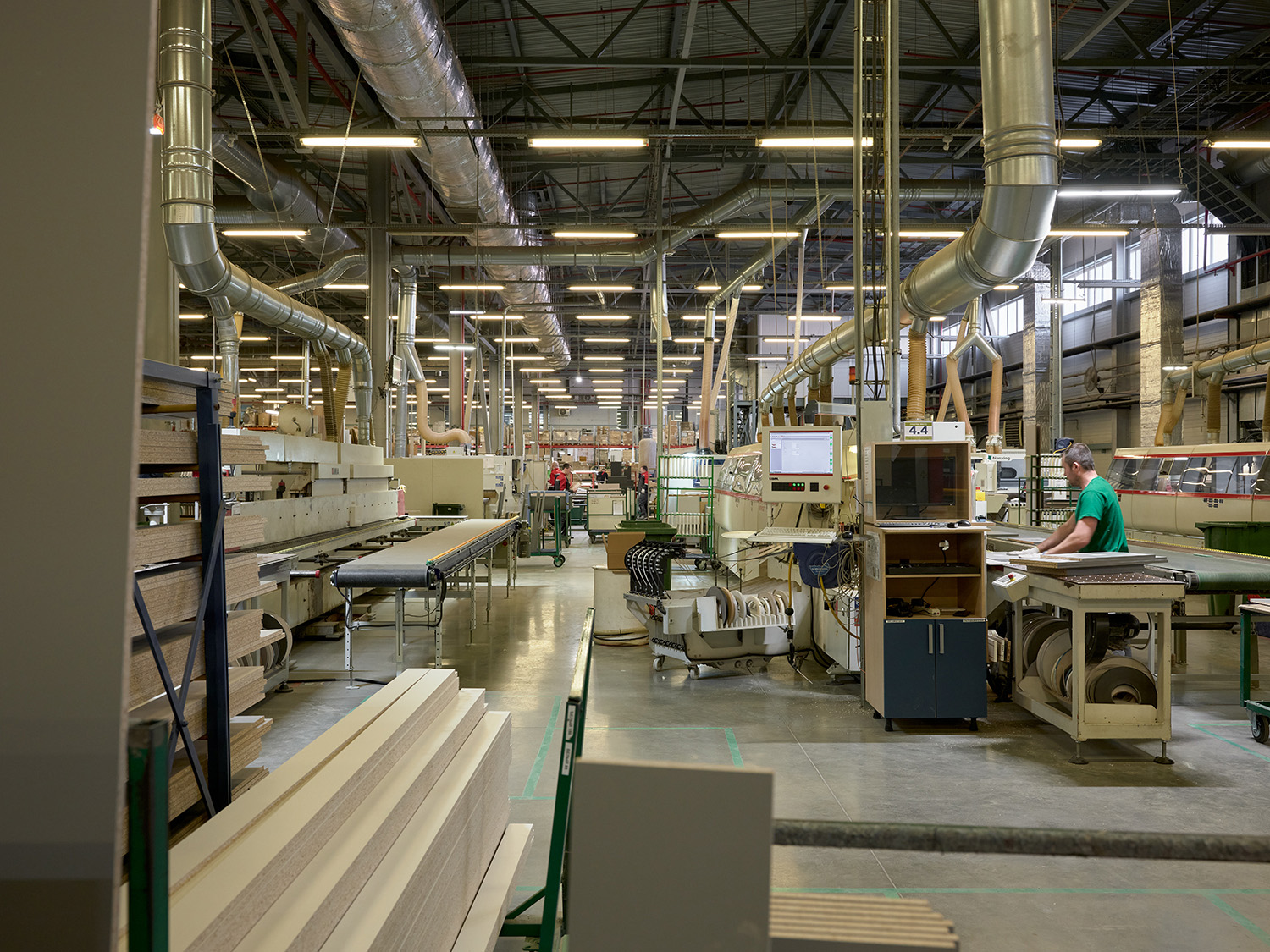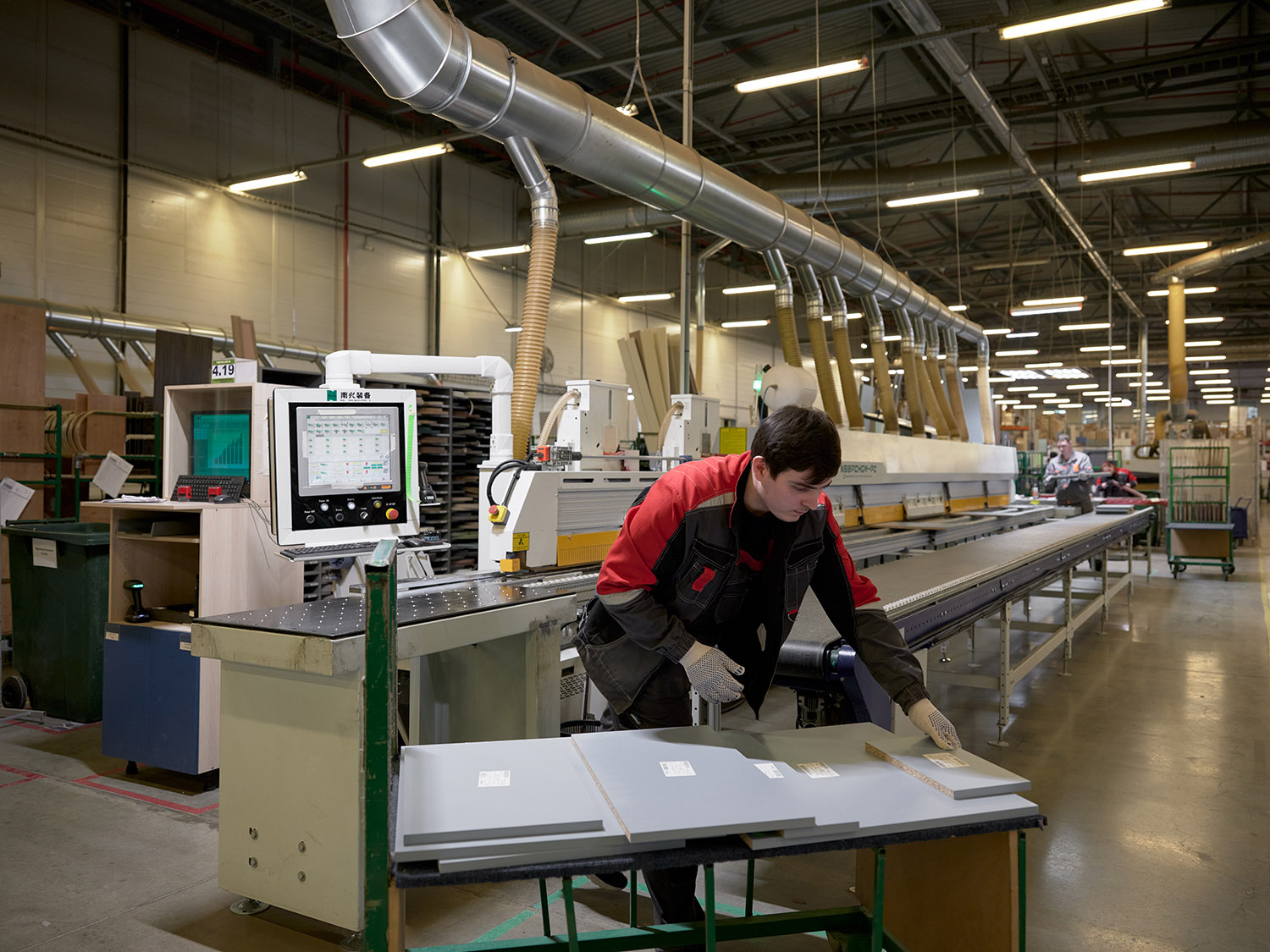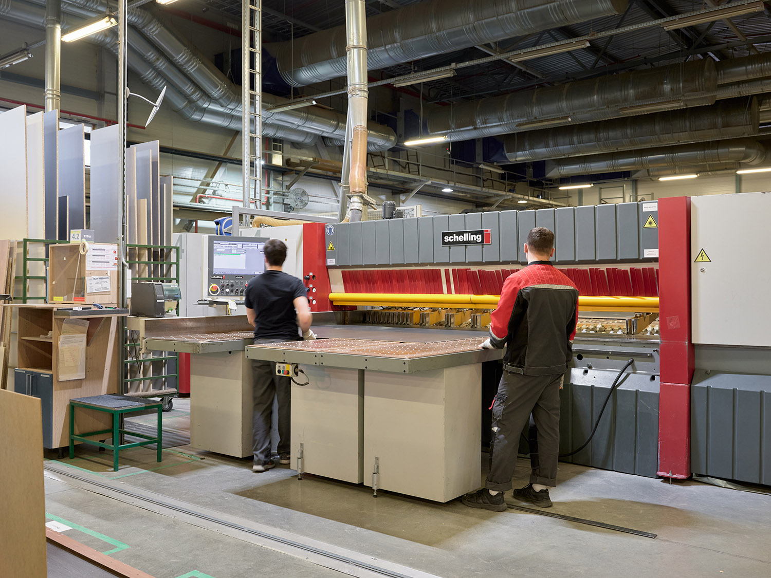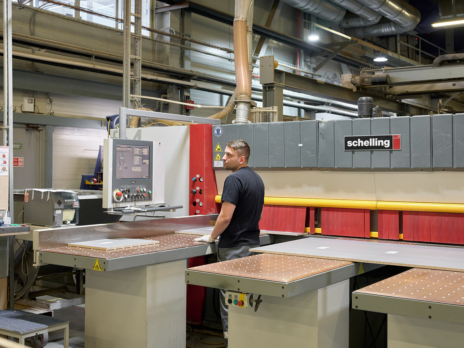 Производство кухни на нашей фабрике начинается с распила немецкой экоплиты на высокоточном распильном оборудовании Schelling.