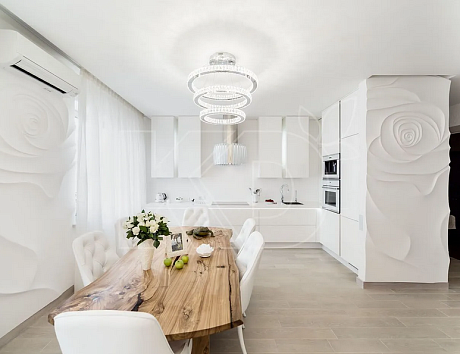Кухни глянец выполняют как в классическом, так и в современных стилях. Наиболее органично такая мебель смотрится в интерьерах хай-тек, модерн, лофт, минимализм. Однако следует помнить, что в абсолютно белой кухне не стоит все поверхности делать глянцевыми – это может утомлять зрение. Отсутствие колористического великолепия прекрасно компенсирует гармония фактур с разной поверхностью. Например, можно выбрать рельефную плитку для оформления кухонного фартука или фактурную штукатурку для стен.