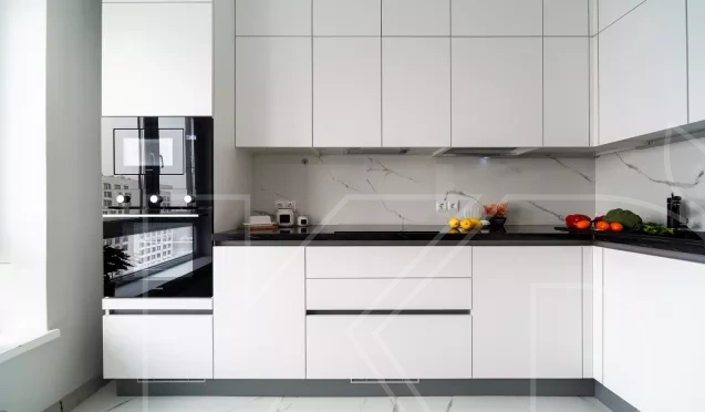 Эстетичность. Кухонная мебель с белоснежными фасадами смотрится благородно и дорого.