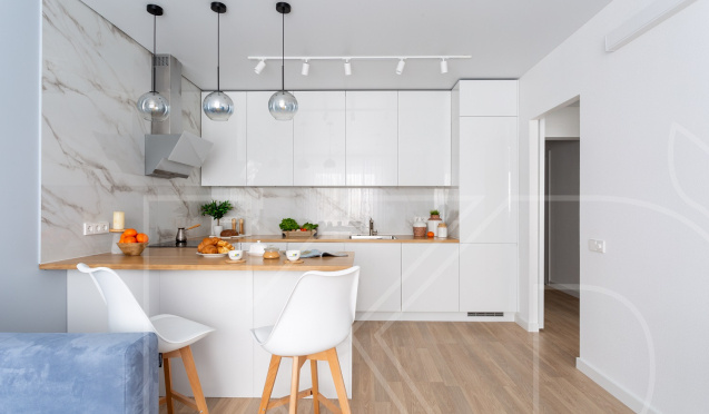 Кухонный гарнитур белого цвета с барной стойкой выглядит очень интересно и оригинально. Такой комплект можно подобрать для помещения любого размера. Выбор зависит от конструкции стойки. Складная версия подойдет для небольшой комнаты, так как после использования ее можно будет убрать, освободив место. Барные стойки стоящие отдельно используются в качестве дополнительной рабочей поверхности или стола и подходят для просторных комнат.