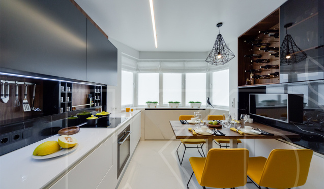 Большая площадь позволяет комбинировать белый цвет с яркими или темными расцветками. При выборе дополнительного тона учитывается интенсивность дневного освещения в помещении. Если в него попадает много солнца, дизайнеры рекомендуют использовать черный, коричневый, темно-серый, бордовый, синий и малахитовый. С помощью этих оттенков можно сыграть на контрасте, подчеркнув красоту светлых фасадов.