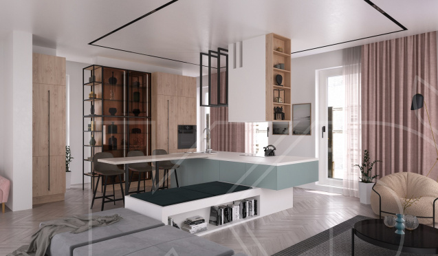 Островной набор мебели подойдет для квартиры-студии больших размеров. С его помощью можно отделить гостиную от обеденной зоны. При этом остров заменит обычный стол для приема пищи, что позволит сэкономить место.