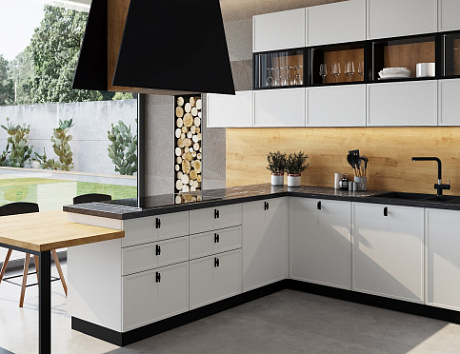 Широкий ассортимент. В белом цвете производят угловые, линейные, П-образные, островные и полуостровные модели, а также версии с барными стойками.