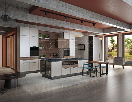 Огромной популярностью среди потребителей пользуются большие кухни в стиле лофт. Модели такого типа выполняют из натуральной древесины, качественного МДФ, шпона.