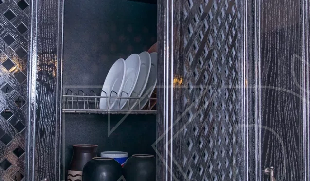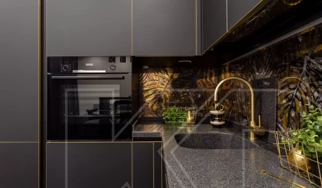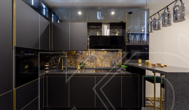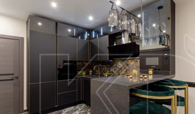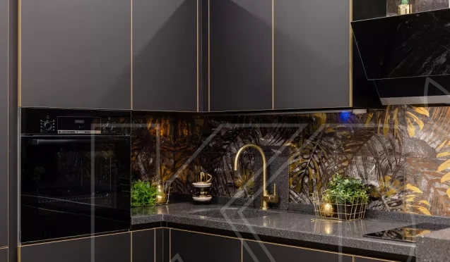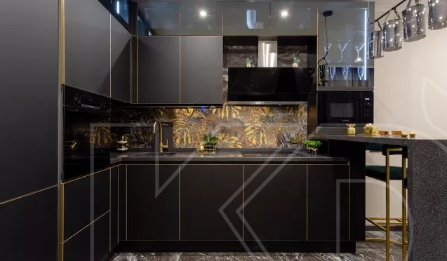 Стиль арт-деко — это смелые геометрические формы и роскошные материалы. Черный — популярный цвет в стиле арт-деко, поскольку он создает резкий контраст с блестящими металлами и отражающими поверхностями. Для воплощения стиля стоит рассмотреть возможность включения черных шкафов с золотыми или латунными акцентами, геометрической плитки для фартука и блестящих черных столешниц. Добавление зеркальных поверхностей или стеклянных подвесных светильников также может усилить ощущение арт-деко.
