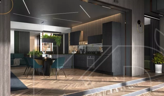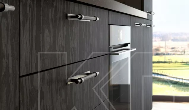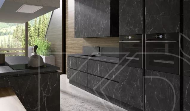 Прямой черный кухонный гарнитур отличается линейным дизайном с прямой столешницей и шкафами, расположенными вдоль одной стены. Прямая кухня идеально подходит для небольших помещений или квартир, поскольку максимально увеличивает доступное пространство, обеспечивая при этом достаточно много места для хранения и работы.
