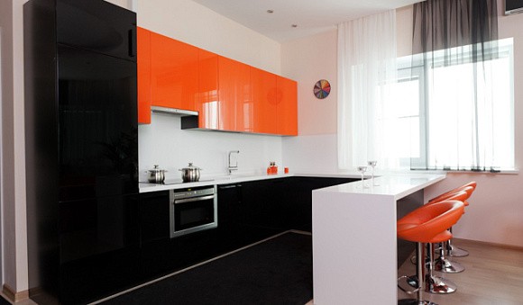 • Рекомендуется выбирать черную кухню в современном стиле. Лучше всего, если фасад будет прямоугольной формы со скрытыми элементами фурнитурами. В зависимости от пожеланий заказчика можно выбирать глянцевую или матовую поверхность.