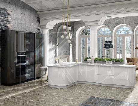 Классические комплекты тоже могут иметь скругленные углы и дверцы. В этом случае дизайн не выглядит слишком футуристично, так как волны используются в небольшом количестве, и сохраняется строгая палитра оттенков.