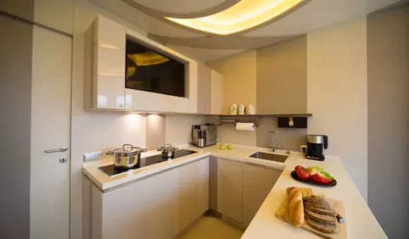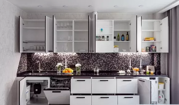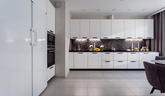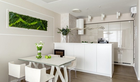 Пожалуй, это самое элегантное цветовое решение для глянцевой кухни. Чем меньше пространства, тем больше должно быть белой палитры, которая добавит простора и воздуха.