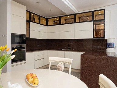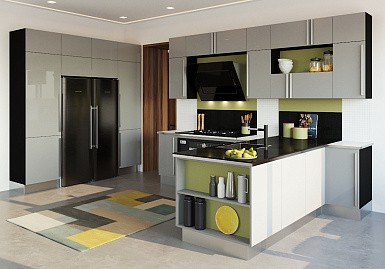 П-образная форма, наоборот, потребует большой площади. Данную конфигурацию обычно выбирают для загородных домов и просторных студий. Шкафы в этом случае устанавливают вдоль трех смежных стен. Преимуществом таких комплектов является вместительность, большое количество рабочих поверхностей и соблюдение правила рабочего треугольника.