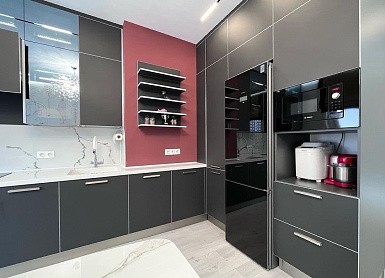 Для просторного помещения можно купить кухню в более насыщенной цветовой палитре. Например, для комнаты, расположенной на северной стороне подойдет модель в более ярких тонах – красных, оранжевых, салатовых, желтых или фиолетовых. В пространство с хорошим дневным освещением удачно встроится коричневая, бордовая, вишневая или темно-синяя версия.