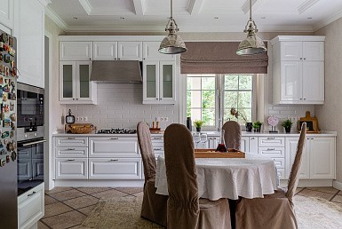 Для дач и загородных домов подходят гарнитуры в стиле кантри. Подобные версии выполняют в теплых природных оттенках – шоколадных, кремовых, бежевых, фисташковых, оливковых и песочных. Сельский стиль не приемлет использования хромированных и пластиковых деталей. Мебель может изготавливаться из искусственных материалов, но с текстурой под натуральное дерево.