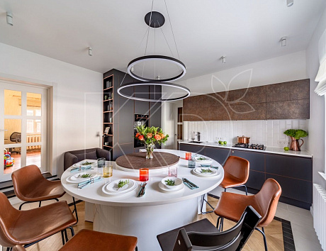 • Классика. Вечно актуальный вариант уместен и в частном доме. Он подойдет кухне с большими окнами и высокими потолками.