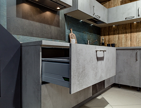 Это еще одна конфигурация, на которую стоит обратить внимание тем, кто решил купить узкую кухню в Москве. Если в конце пространства нет окна и батареи, то угловая расстановка – это отличное решение. В рамках нее гарнитур размещают в конце помещения вместе с мойкой и холодильником. Это позволяет освободить максимум пространства в начале комнаты и в центре. На свободной территории можно поставить обеденный стол, диван, шкаф-пенал или другую мебель.