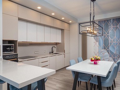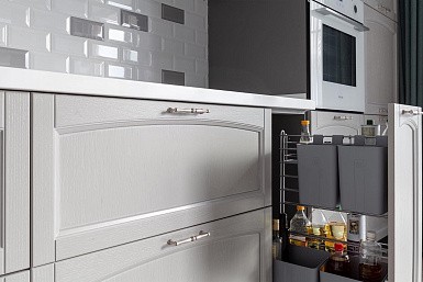 Сегодня в тренде кухонная мебель, достигающая потолка. Это не только эффектно смотрится, но и решает множество вопросов, связанных с хранением посуды и бытовой техники. По цвету антресоли могут совпадать с основными модулями, а могут отличаться.