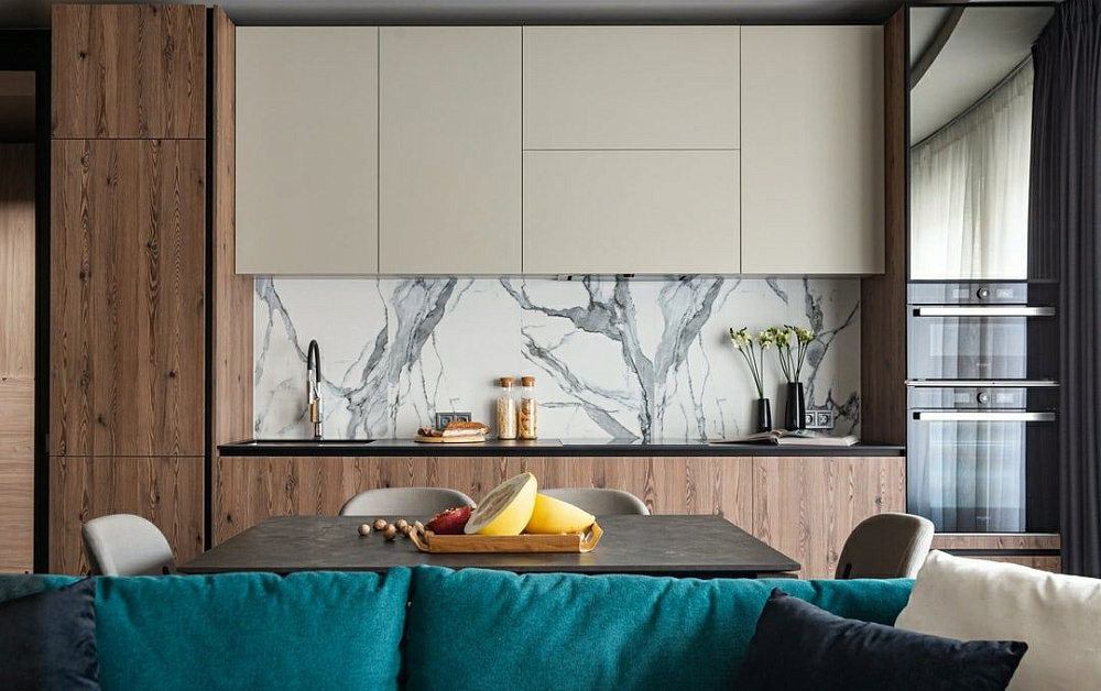 В небольших комнатах с цветовой палитрой особо не разгуляешься. Как правило, для таких пространств выбирают бежевые, белые и другие светлые оттенки. Но это не значит, что кухня должна быть унылой и монотонной. На помощь придет умеренное применение модных расцветок – черного, антрацитового и темно-серого. Использовать эти цвета можно для отделки цоколей, фурнитуры, открытых навесных полок.