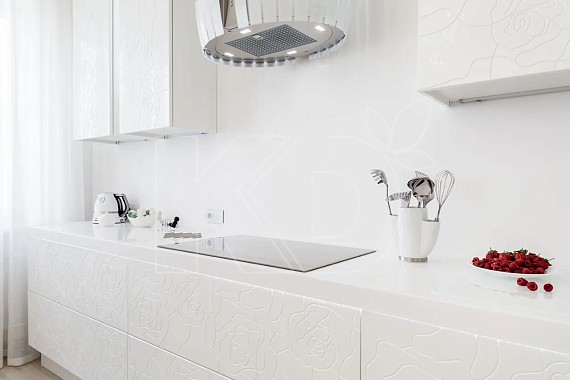 И еще один образец в линейке «Кухонный Двор» – «Фаворит 3 с фрезеровкой Роза». В этой модели современный стиль сливается с природными мотивами. Главным акцентом в кухне глянец с фрезеровкой выступает изящная фрезеровка в виде цветов. Она смотрится свежо и эстетично.