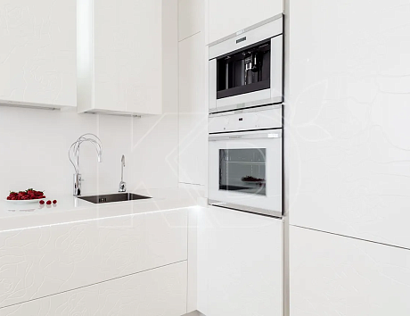 У этой модели есть еще одна версия, дополненная фрезеровкой - «Новая волна». Здесь большая часть верхних фасадов выполнена из МДФ цвета белого глянца, а вторая часть дополнена волнообразной фрезеровкой золотого цвета.