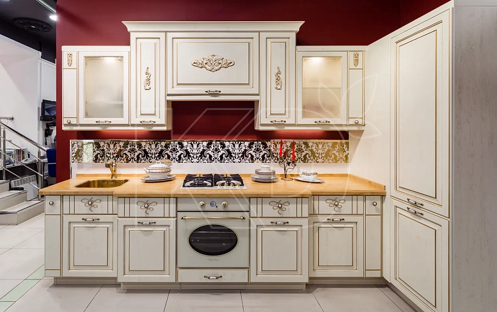 Классическая кухня отличается элегантностью, изяществом и роскошью. Подобные решения подходят для просторных помещений с высокими потолками и большими окнами. В небольших комнатах кухонная мебель в стиле классика будет смотреться несколько нелепо и вычурно из-за того, что для ее оформления используется роскошный декор – позолоченные элементы, лепнина, резьба, патина, изогнутые ручки.