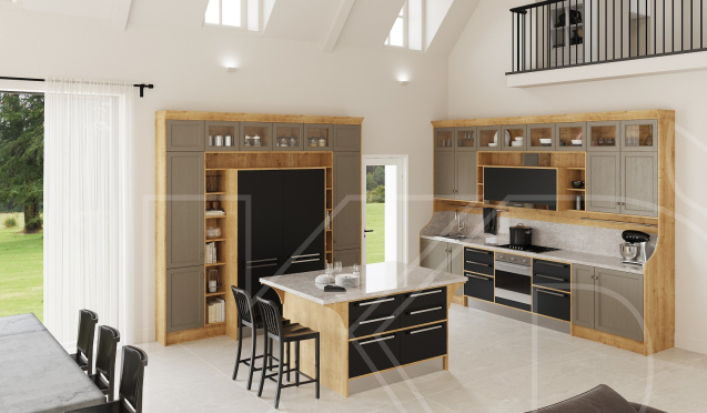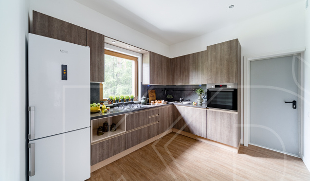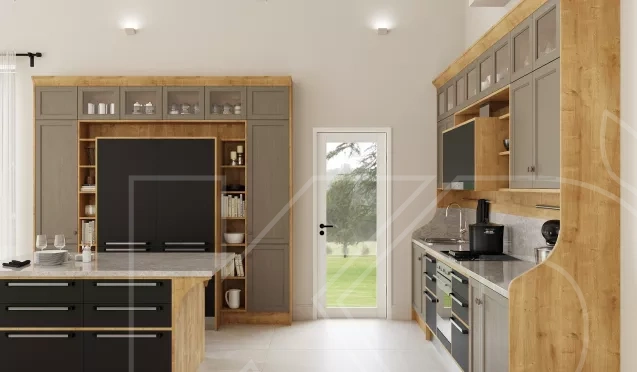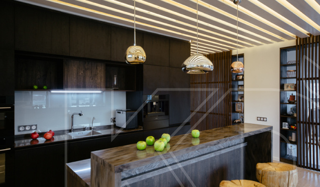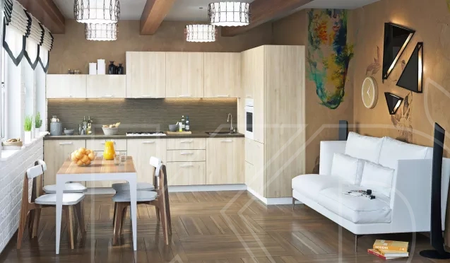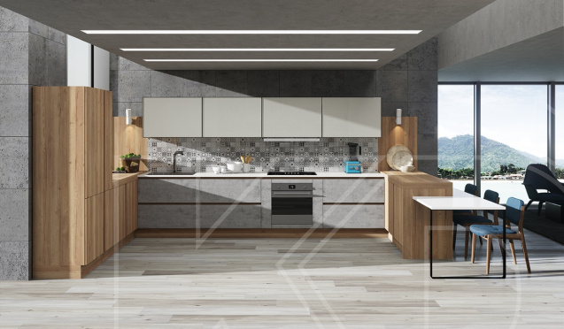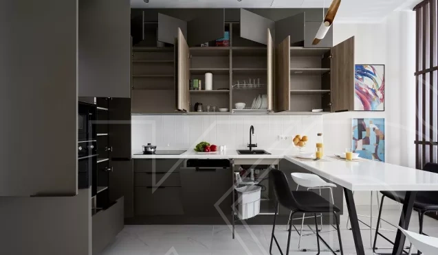 • Широкий ассортимент. Планировка комплекта может быть линейной, П-образной, островной, угловой. Интересно выглядят модели с барными стойками.