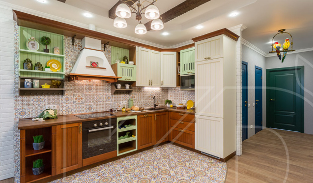В загородных домах и на дачах часто устанавливают модели в стиле кантри. В этом случае используются кофейные, шоколадные и ореховые оттенки. Мебель такого типа декорируют решетками, растительными орнаментами. Для оформления интерьера используют глиняную посуду, натуральный текстиль, горшечные растения.
