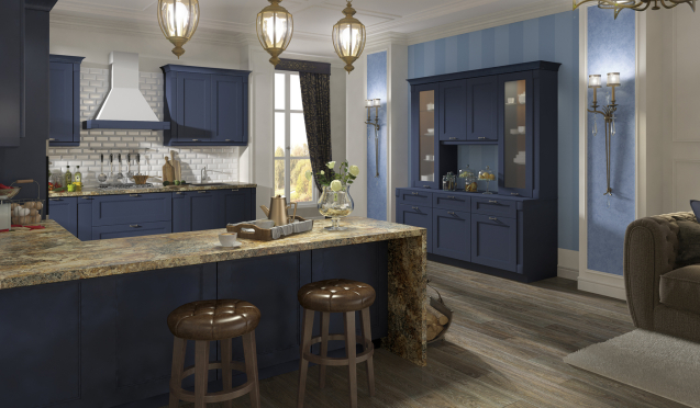 Синие кухни. Синяя мебель в духе неоклассика смотрится свежо и стильно. Чернильные, кобальтовые, черно-синие оттенки будут хорошо смотреться в больших комнатах. Бледно-васильковые, небесные и сизые тона подходят для средних и компактных помещений.