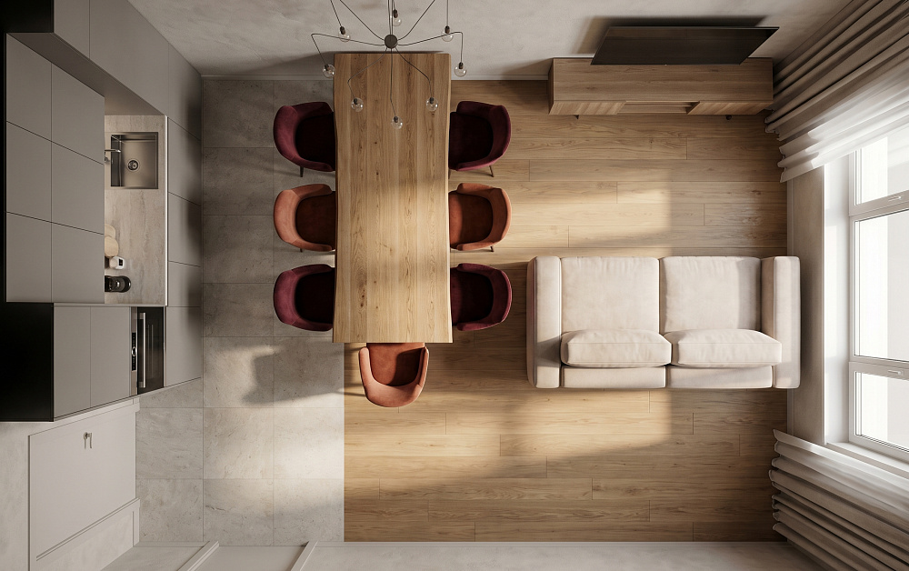• Разные покрытия для кухни и гостиной (плитка + паркет).