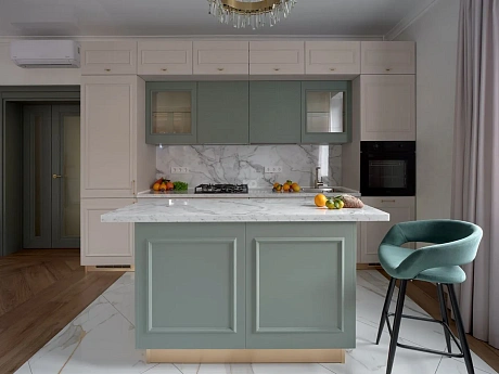 В больших квартирах часто объединяют кухню с обеденной или гостиной зоной, чтобы пространство выглядело свободнее и светлее. Диван, мягкие кресла или полноценная столовая группа помогают создать уютный уголок для отдыха, семейных ужинов и общения с друзьями, превращая кухню в настоящее сердце дома.