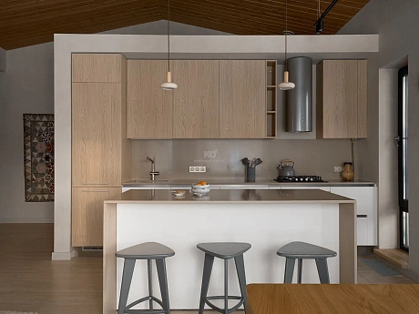 Остров или полуостров выполняют сразу несколько функций: рабочая поверхность, обеденная зона, дополнительные системы хранения и элемент зонирования. Барная стойка отделяет рабочую зону от гостиной, при этом не перекрывая пространство визуально.