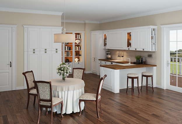 Приветствуются нейтральные цвета, полированная отделка. Выбирают главные цвета в виде мягких оттенков серовато-дымчатого, пепельного, серо-голубого, светло-коричневого цвета. Оживляется пространство яркими тонами: красным, зеленым, синим, которые могут находиться на обоях, шторах. Кухни классика модерн – великолепие идей и стиля.