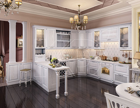 • Вместительность. Гарнитур такого типа включает большое количество навесных и напольных шкафов, открытых и закрытых полок, секций для хранения бутылок.