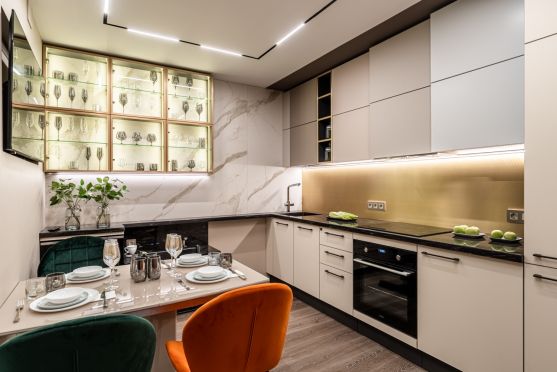 Вариаций Г-образных планировок множество. Такая расстановка выглядит очень стильно и как нельзя лучше позволяет скомпоновать зону приготовления пищи с уютной столовой даже в малогабаритном помещении.