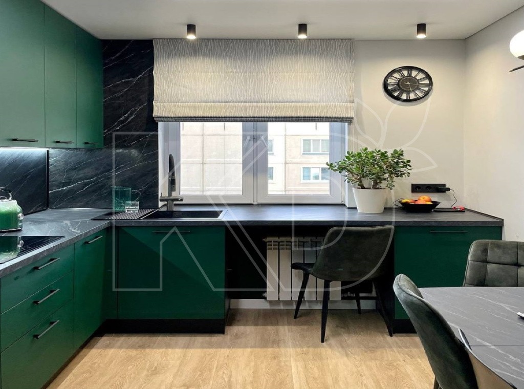 Г-образная планировка кухни обеспечивает комфортное для работы пространство. При такой форме лита, раковина и все нужные шкафы находятся под рукой.