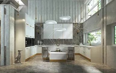 Для просторной квартиры-студии идеальным решением станет островная модель кухни. Гарнитур с такой планировкой подходит для зонирования помещения, потому что остров способен визуально отделить кухню от остального пространства.