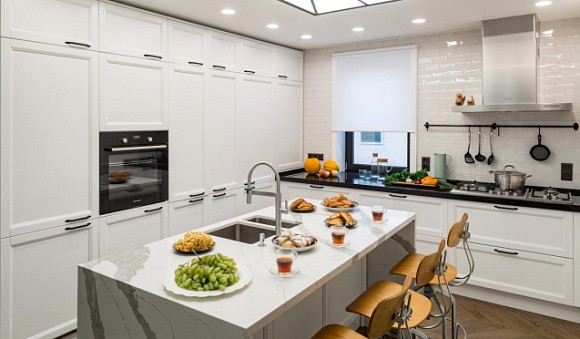 Для обустройства кухни выбирают гарнитуры из натурального массива (реже ДСП или МДФ). Если комната просторная, то можно установить кухни с островом. Они позволяют практично организовать пространство. Также популярны кухни с полуостровом и кухни с барной стойкой. Они занимают чуть меньше места.