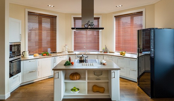 Для обработки рабочей зоны П-образной кухни можно использовать керамическую плитку, материалы, имитирующие кирпичную кладку. Зачастую для декоративной отделки используют мозаику. В качестве напольного покрытия лучше использовать прочные деревянные доски или паркетную доску. Потолок обустраивают деревянными балками, но в современном варианте можно обойтись и без них.