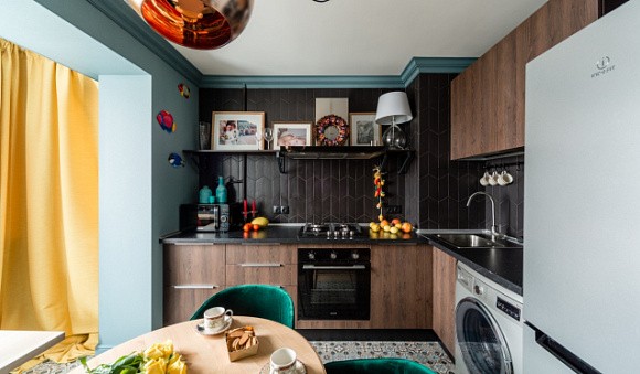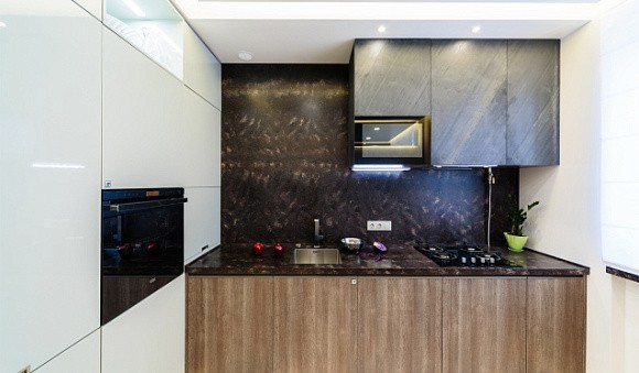 • кухня темных цветов удачно сочетается с графитово-серым оттенком;