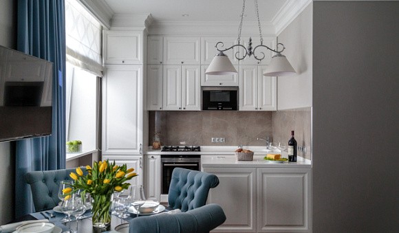 Кухни неоклассика. В таких гарнитурах гармонично сочетаются строгие классические линии и функциональность модерна. Для удобства их оснащают большим количеством полок, ящиков, шкафов. Расцветка неоклассических комплектов может быть как однотонной, так и комбинированной. В качестве декора применяются вставки из металла и стекла, эффектная фурнитура.