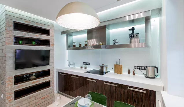 Встроив в комнату кухонный гарнитур, можно приступать к установке плиты, вытяжки, холодильника и других бытовых приборов. Также на этом этапе монтируются светильники над рабочей зоной. Не рекомендуется подключать электрооборудование самостоятельно, лучше доверить это специалисту, который обеспечит грамотный монтаж.