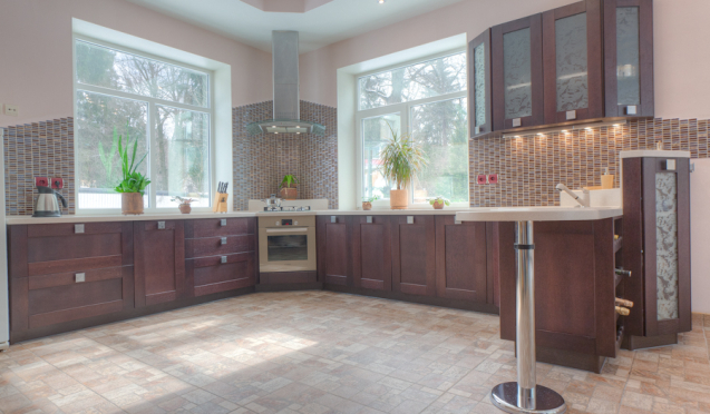 Выполнение черновых работ зависит от типа основания. Для бетонной основы сначала делают стяжку. Если перекрытия деревянные, сначала проверяют их прочность и целостность, затем заливают смесью. Финишная отделка пола выбирается из соображений практичности, так как поверхности на кухне легко загрязняются. Наиболее подходящими считаются плитка и керамогранит. Но следует учесть, что это холодные материалы, поэтому для них рекомендуется опция «теплый пол». Также на кухне можно использовать следующие материалы: