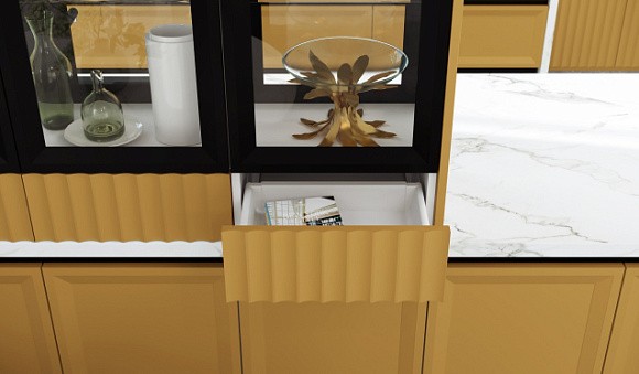 Классические гарнитуры выпускают в приглушенных оттенках – горчичном, светло-желтом, песочном. Золотистые элементы могут использоваться для декоративной отделки фасадов. Пространство, в котором будет находиться желтая кухня классика, следует оформить подобающе. Выбрать качественные обои для отделки стен, на окна повесить плотные шторы. Особое внимание следует уделить подсветке. Так, точечным светильникам необходимо предпочесть роскошную люстру.