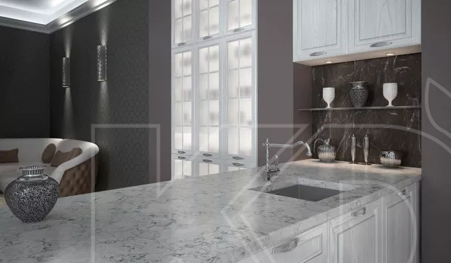 Золото в кухонном пространстве можно использовать акцентно. Например, для отделки фартука или столешницы. При этом поверхность может быть как однотонной, так и с золотыми разводами, вкраплениями, штрихами. А чтобы такой гарнитур смотрелся еще интереснее, выберите для него позолоченные ручки.