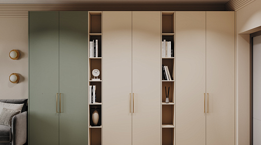 Открытые секции добавляют шкафу визуальной лёгкости — здесь удобно расставить керамику, свечи или журналы, превратив мебель в часть вашей личной истории.