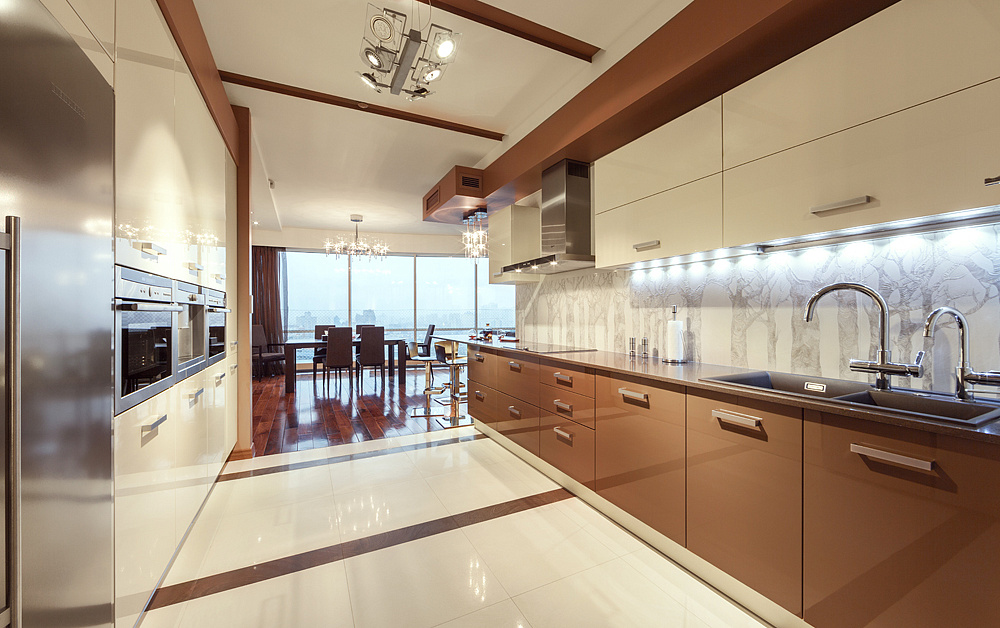 Задача: сконструировать и создать современную, практичную и удобную кухню с учетом таких особенностей интерьера, как отсутствие естественного освещения, параллельное расположение стен, вдоль которых нужно разместить фасады гарнитура.