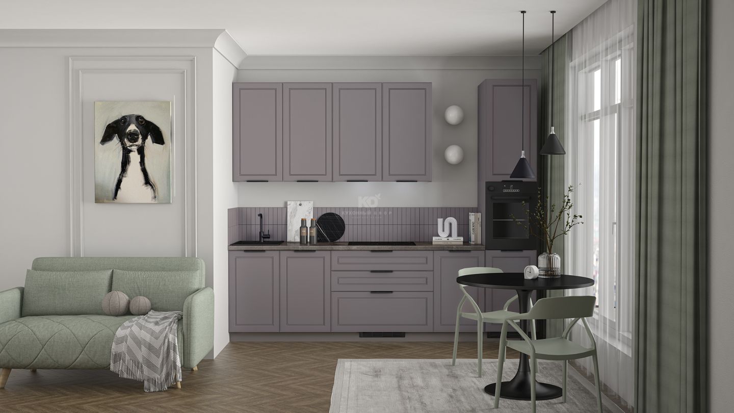Фасады Леи изготовлены из МДФ, покрытой экомембраной в технологии 3D-окутывания без кромок, что обеспечивает устойчивость к механическим повреждениям и долговечность. Они приятны на ощупь и придают интерьеру благородный, сдержанный вид. В комплектацию входят все необходимые элементы, включая столешницу, фурнитуру и пеналы для встроенной техники. Итог — чистота линий и максимум полезного пространства при визуальной компактности.